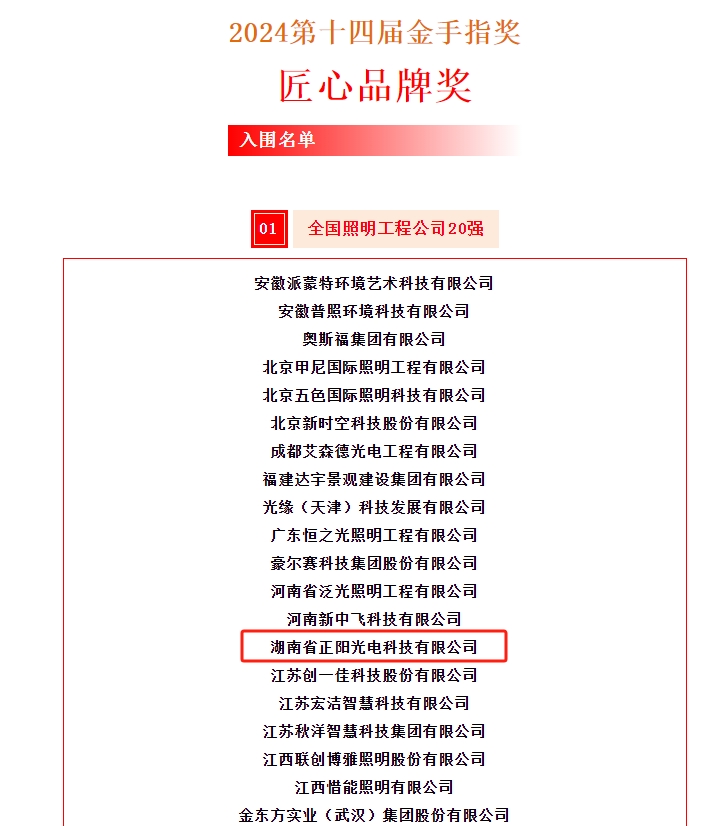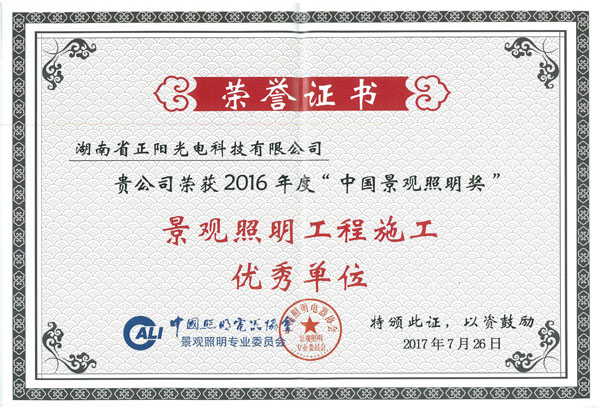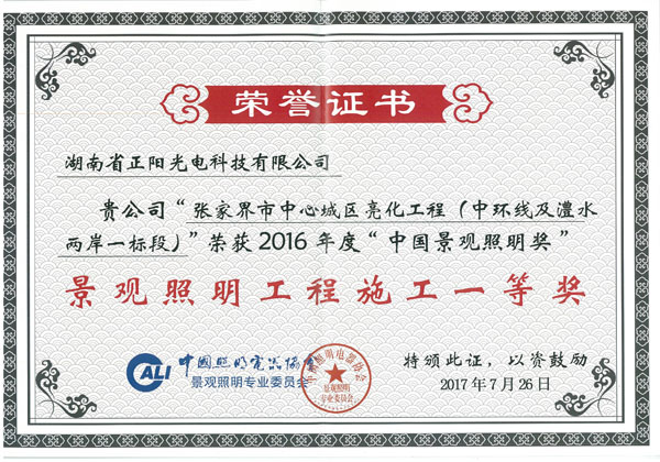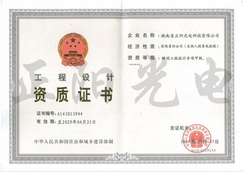 湖南省正陽(yáng)光電科技有限公司是一家從事亮化工程及大型燈光藝術(shù)的設(shè)計(jì)、制作、安裝和維護(hù)于一體的專(zhuān)業(yè)化公司。公司資質(zhì)齊全、管理嚴(yán)謹(jǐn)、技術(shù)先進(jìn)、實(shí)力雄厚,取得了城市及道路照明工程專(zhuān)業(yè)承包壹級(jí)資質(zhì)、照明工程設(shè)計(jì)專(zhuān)項(xiàng)甲級(jí)資質(zhì)、國(guó)家高新技術(shù)企業(yè)、國(guó)家“重質(zhì)量·守誠(chéng)信”示范企業(yè)。